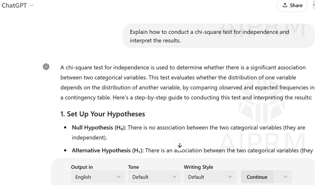 Example prompt: “Explain how to conduct a chi-square test for independence and interpret the results.”